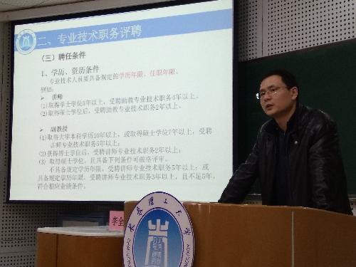 人事处处长李全勇从学校的师资队伍建设情况、专业技术职务评聘、工资情况、岗位聘任及管理、教职工考核与管理、社会保险与福利等六个方面为新教师全面解读了学校的人事制度及职称评定规则,同时,他鼓励新教师应增强紧迫感,合理制定个人发展规划,尽快找准发展方向和前进目标。